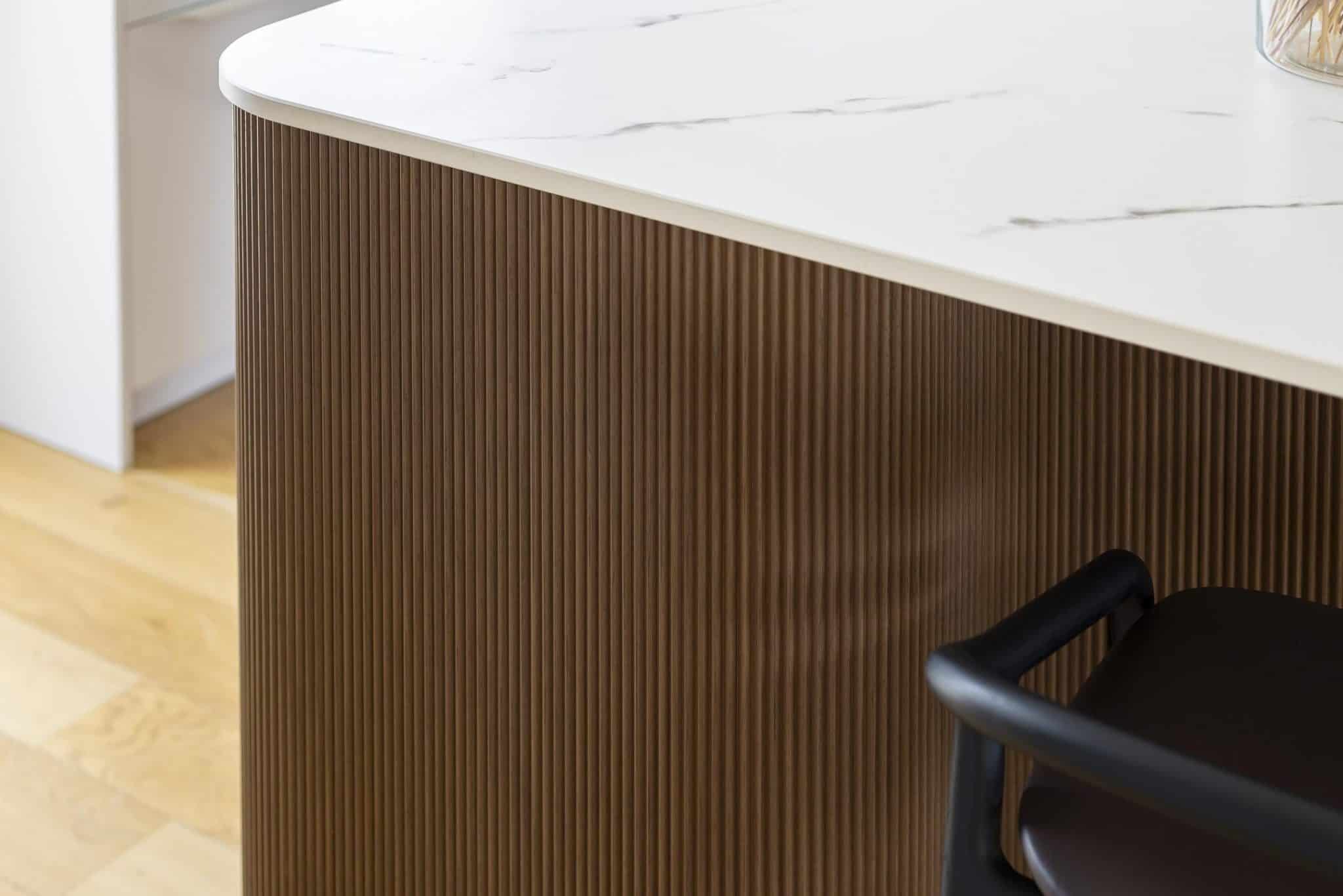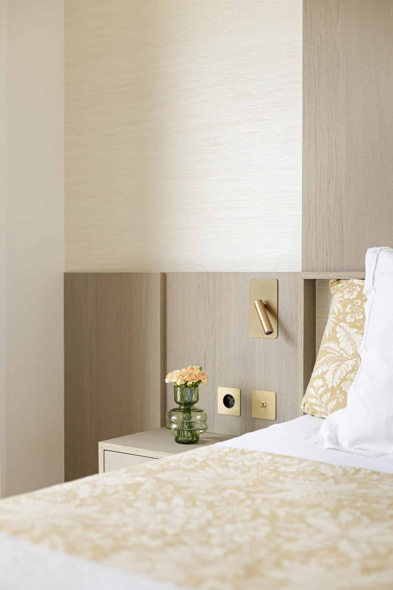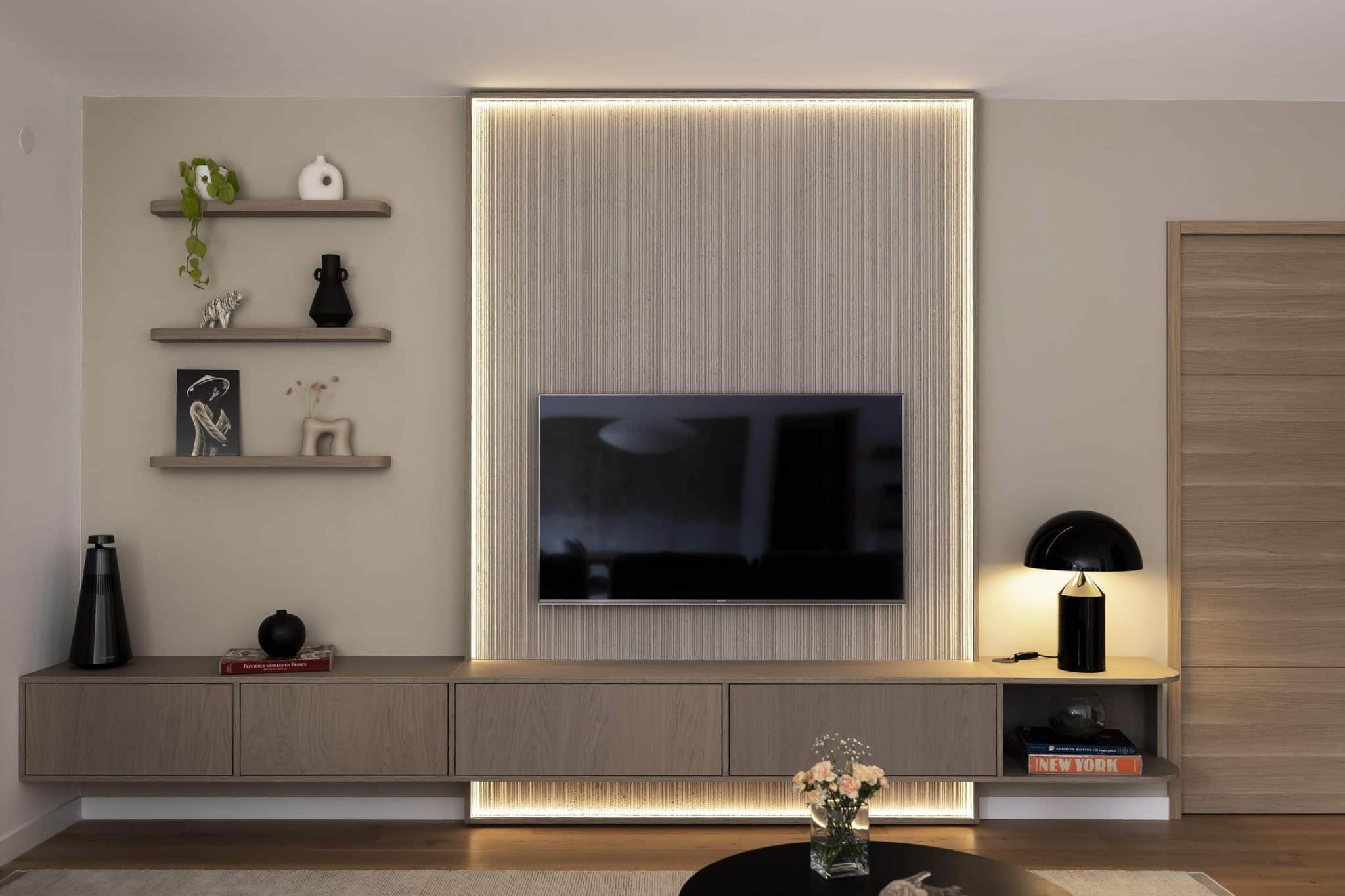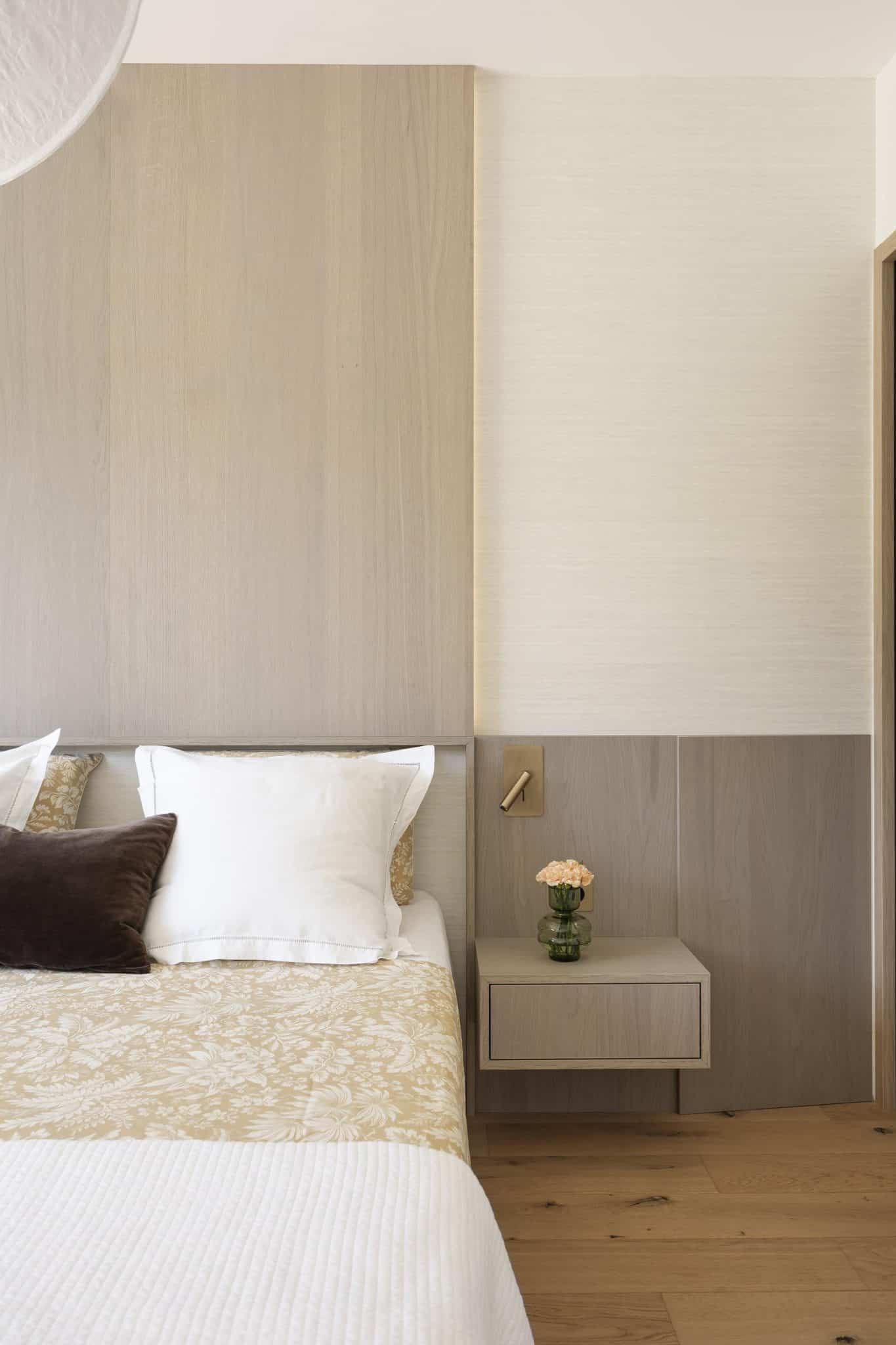 La palette, volontairement douce, mêle tons poudrés et textures naturelles. Le bois, les enduits minéraux et les textiles apportent relief et confort visuel. Les agencements sur-mesure, aux lignes souples et enveloppantes, structurent les volumes tout en créant un fil conducteur entre les pièces.